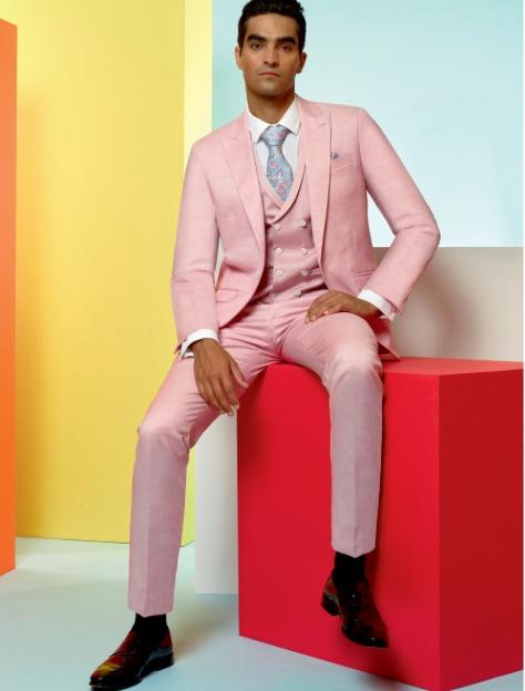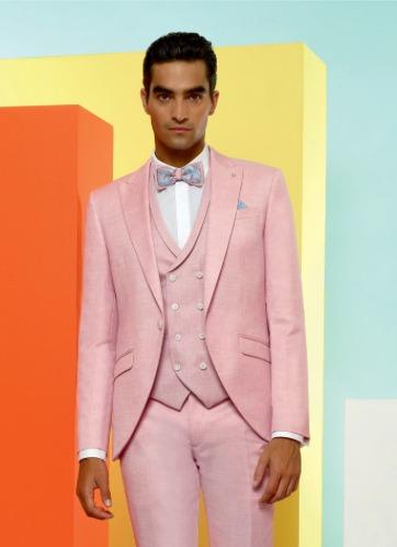 Traje de Novio de tres piezas en color rosa. Chaleco con solapa ajustable con hebilla. Composición: 92% poliéster, 5% viscosa, 2% lino y 1% elastano. Forro: 55% poliéster y 45% viscosa. Incluye corbata y pañuelo estampados.