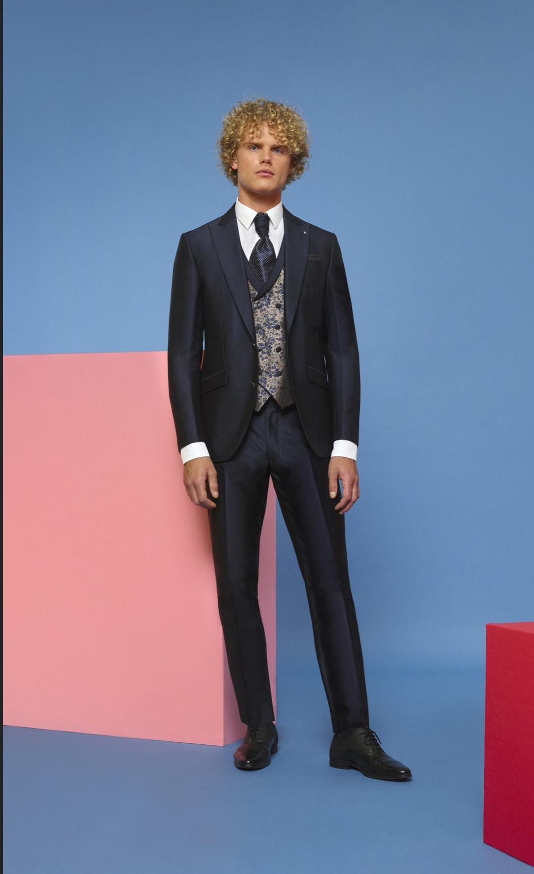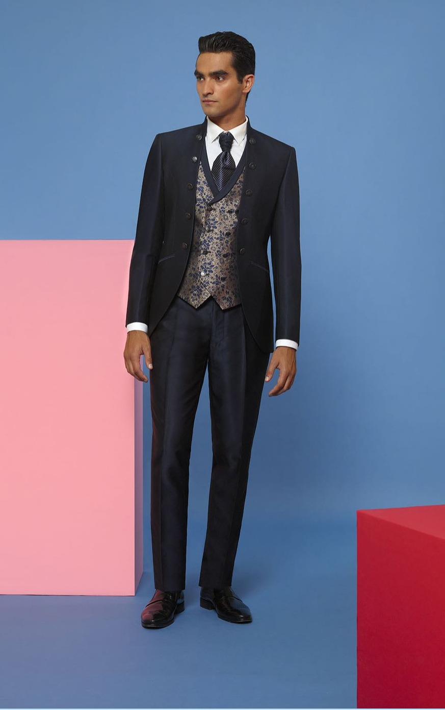 Traje de Novio de tres piezas más el corbatón. Americana con cuello mao azul marino y unos bonitos botones a cada lado con un brillantito azul en el medio. Chaleco con solapa combinado en color dorado con grabado floral en marino. Ajustable en espalda. El corbatón ajustable en marino con grabado en dorado. Modelo slimfit.