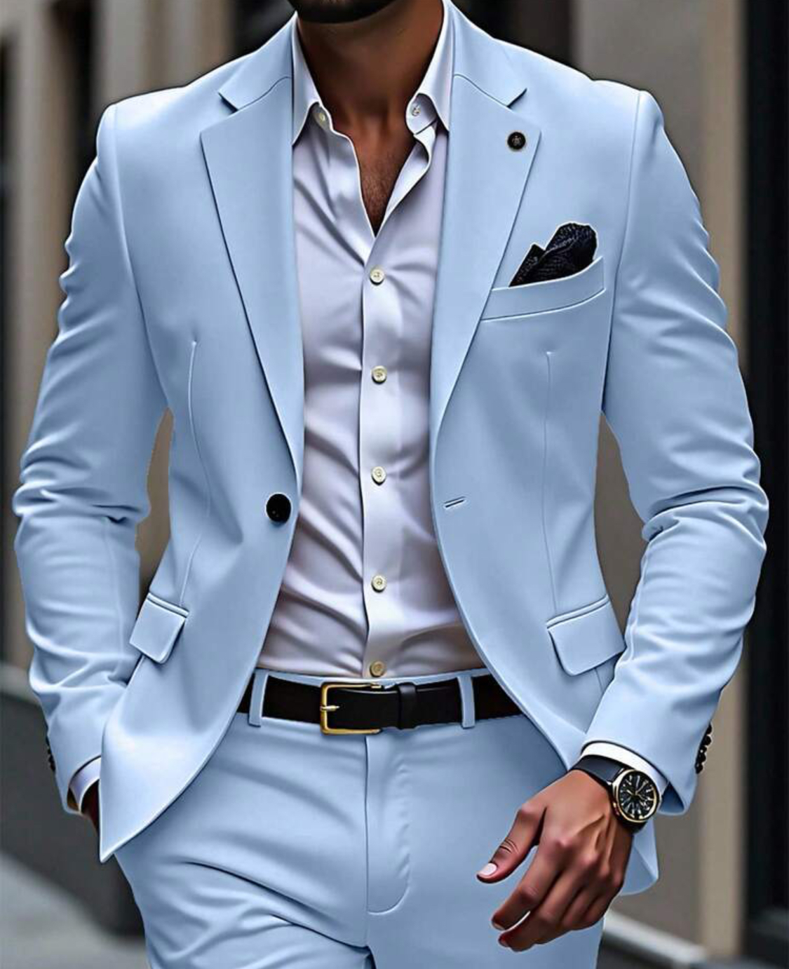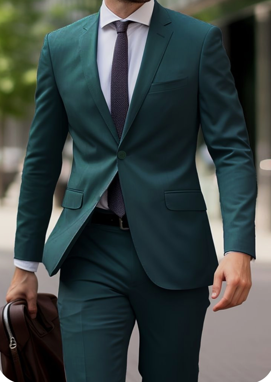 Traje de dos piezas. Americana entallada con doble bolsillo lateral derecho. Forro del mismo color. Pantalón pitillo.