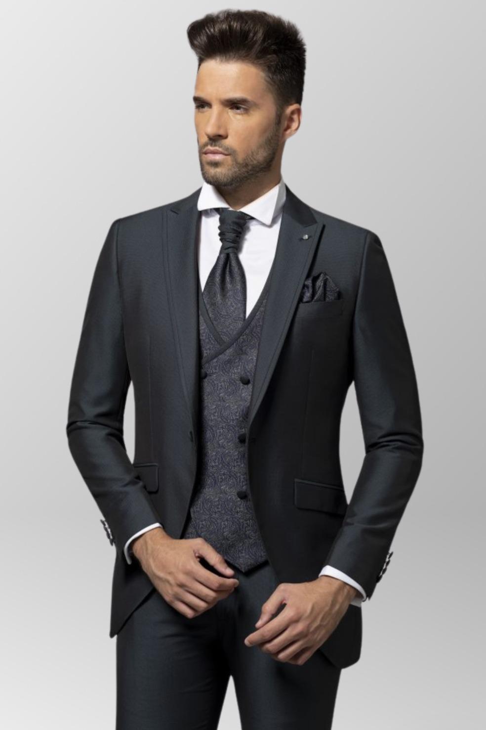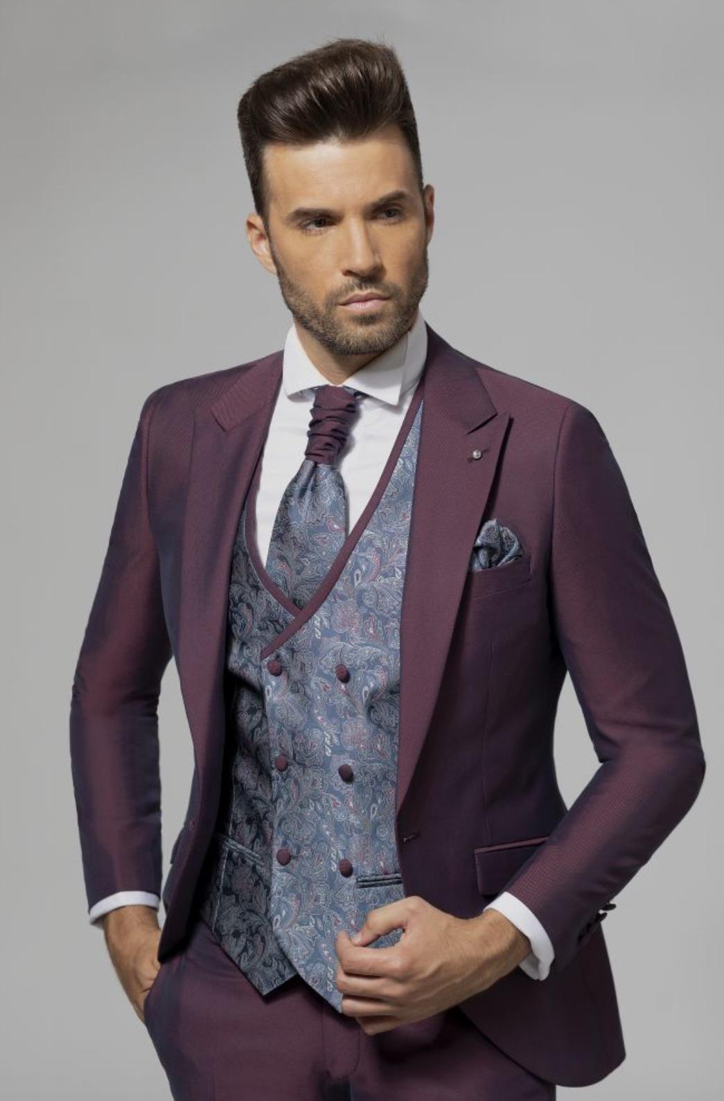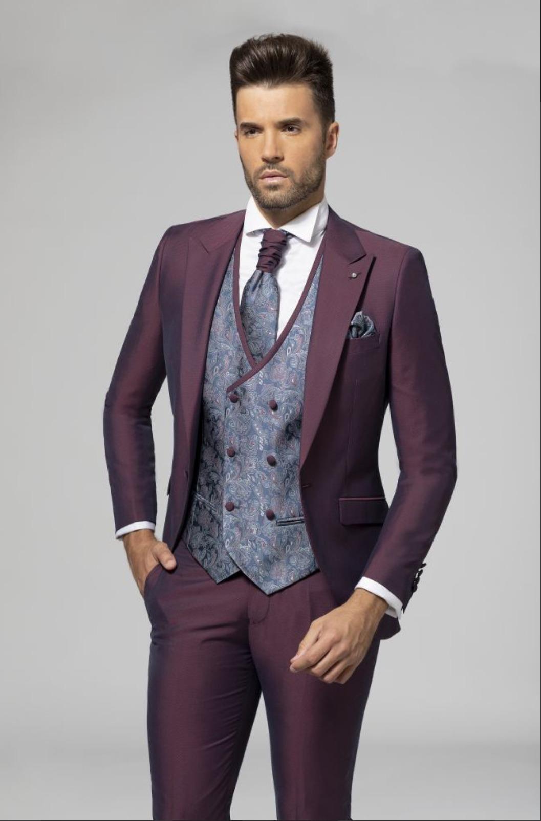 Traje de Novio de tres piezas con solapa. Chaleco cruzado con dibujo de cachemir ajustable en espalda. Corbatin ajustable en cuello y pañuelo a juego chaleco. Disponible en dos colores: verde y burdeos.