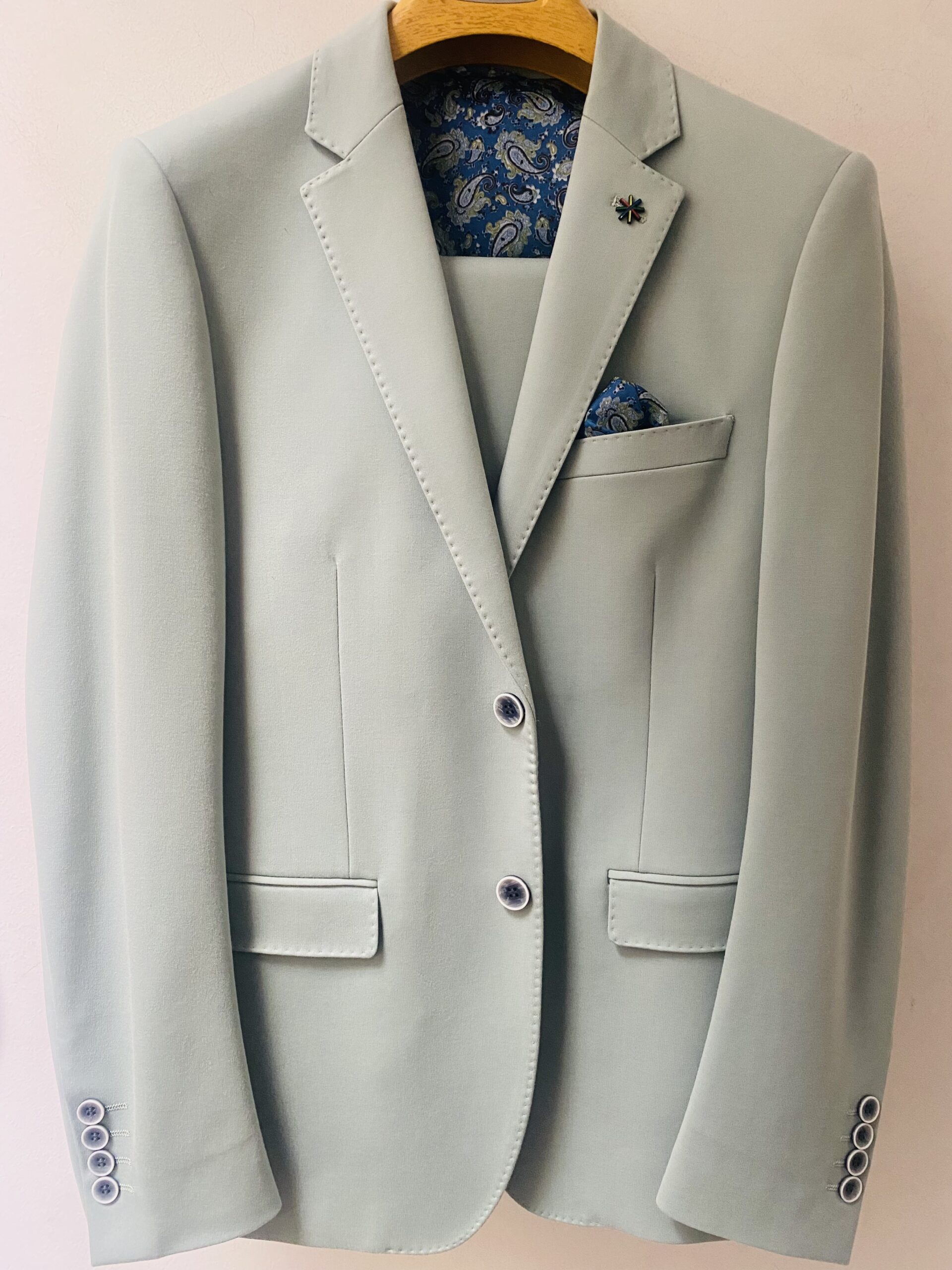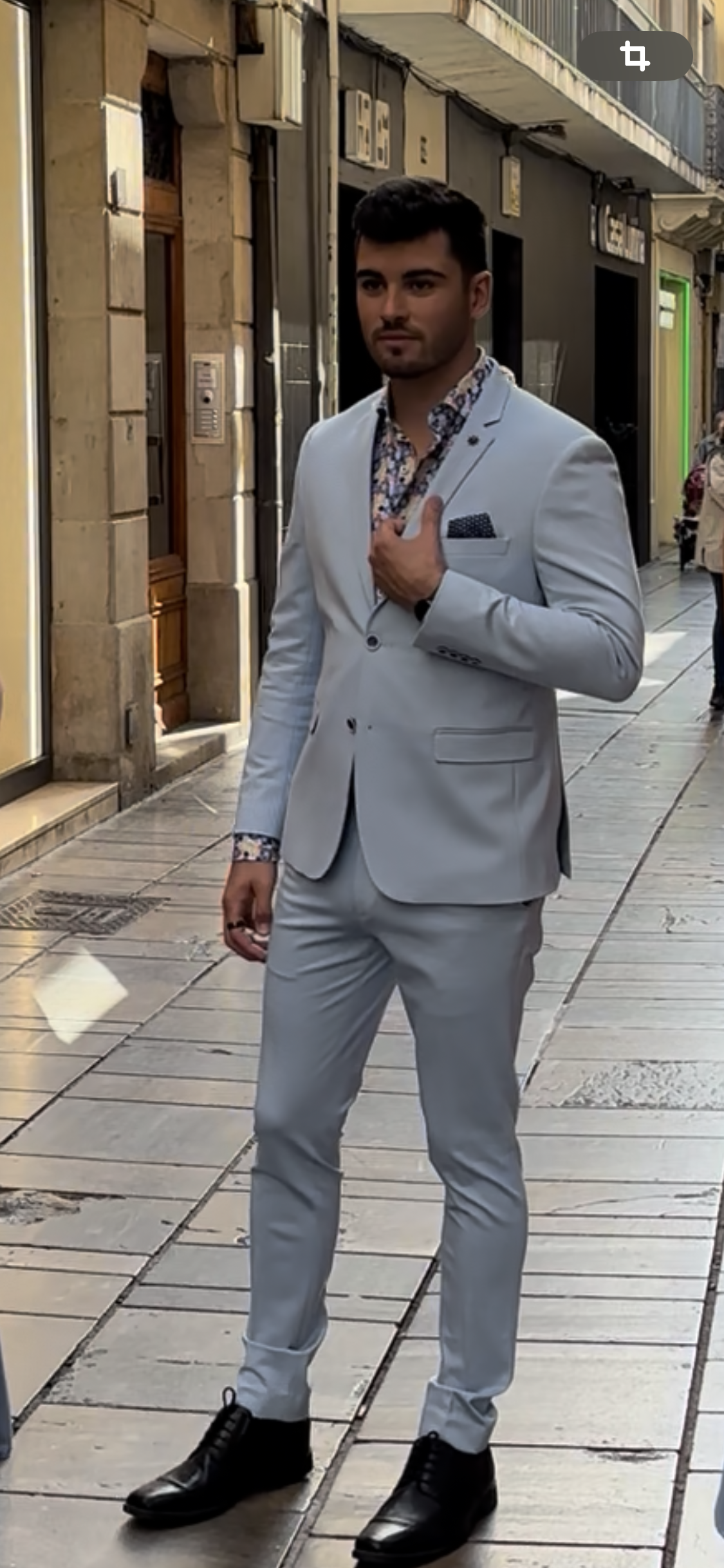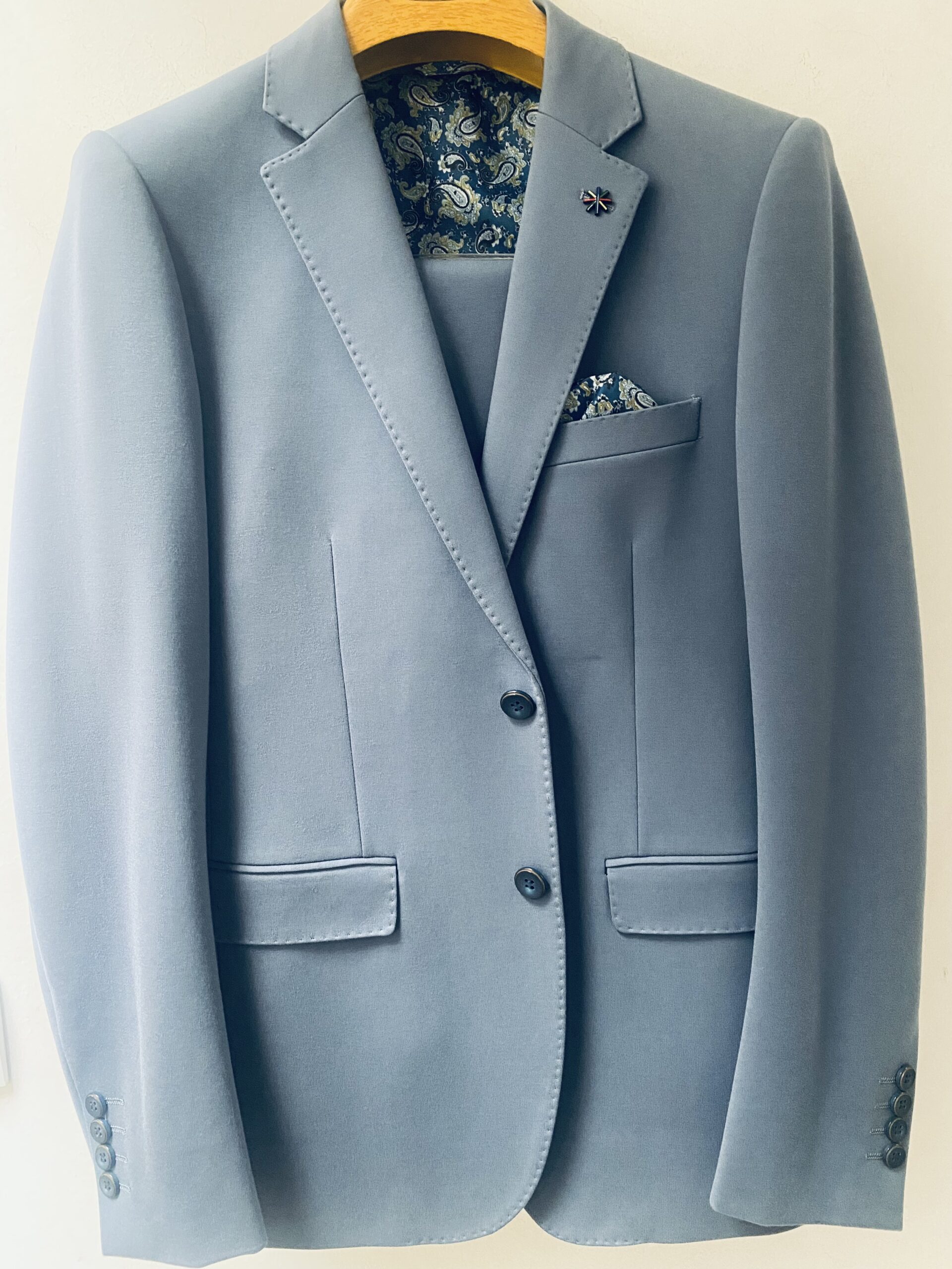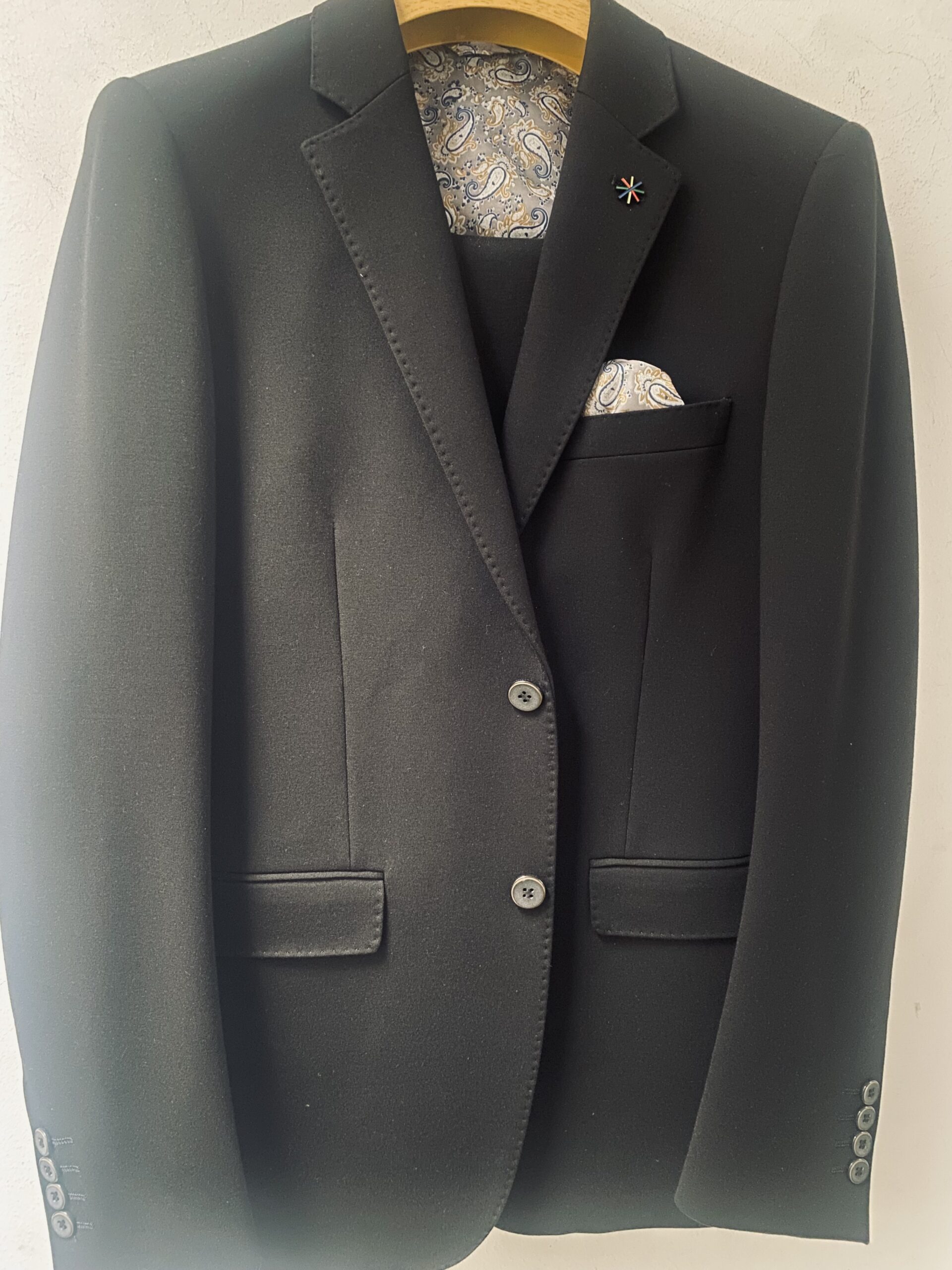 Traje de dos piezas. Americana entallada, muy cómoda, dada su elasticidad se adapta muy bien a cualquier tipo de constitución. Pantalón pitillo con cintura ajustable.