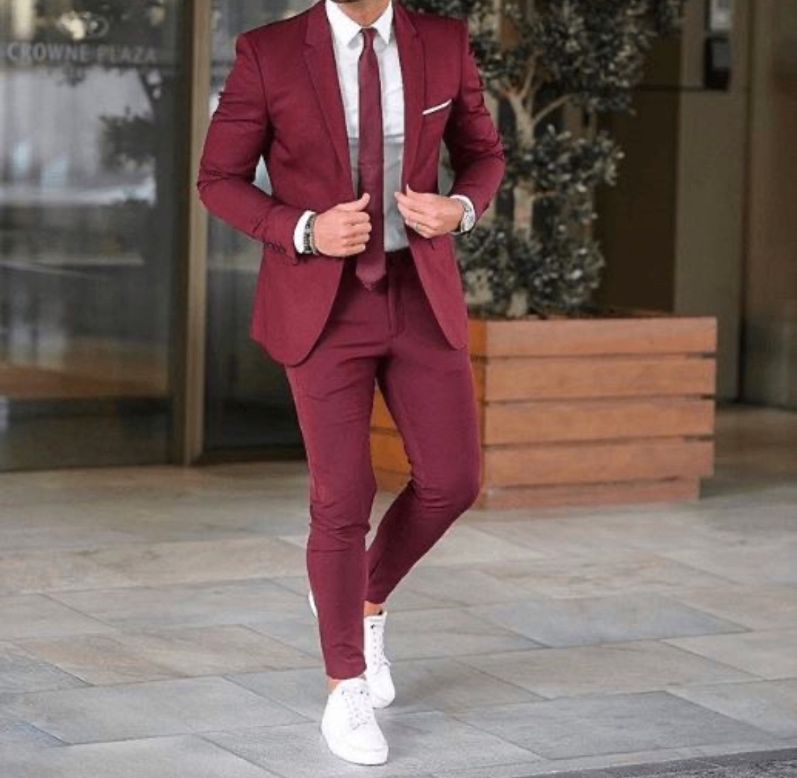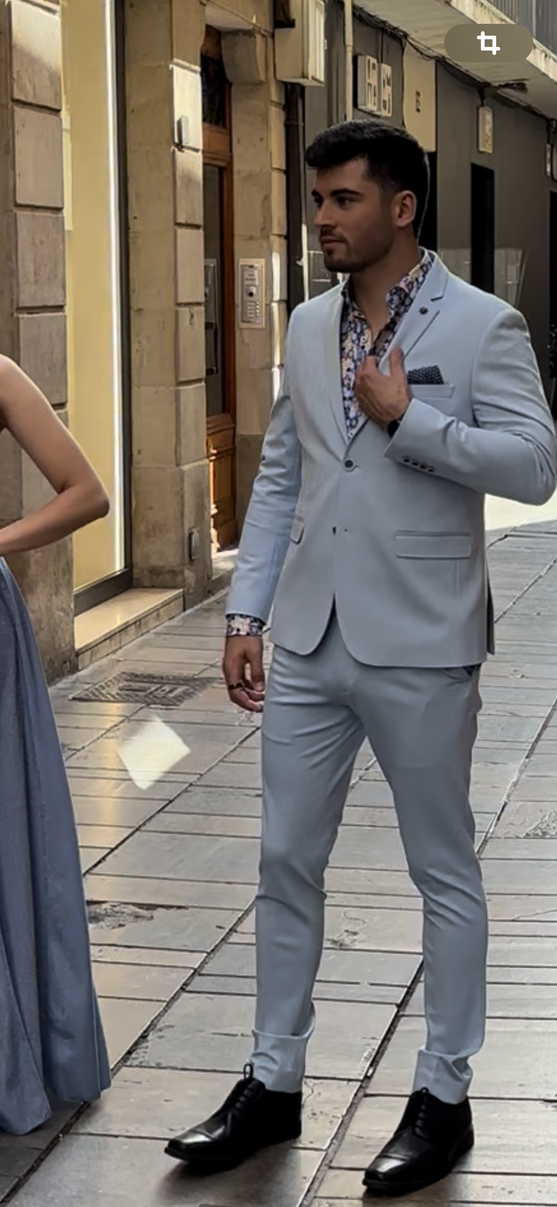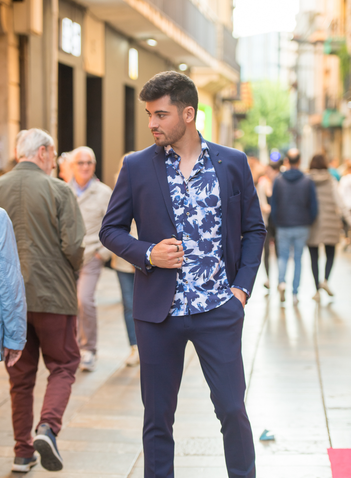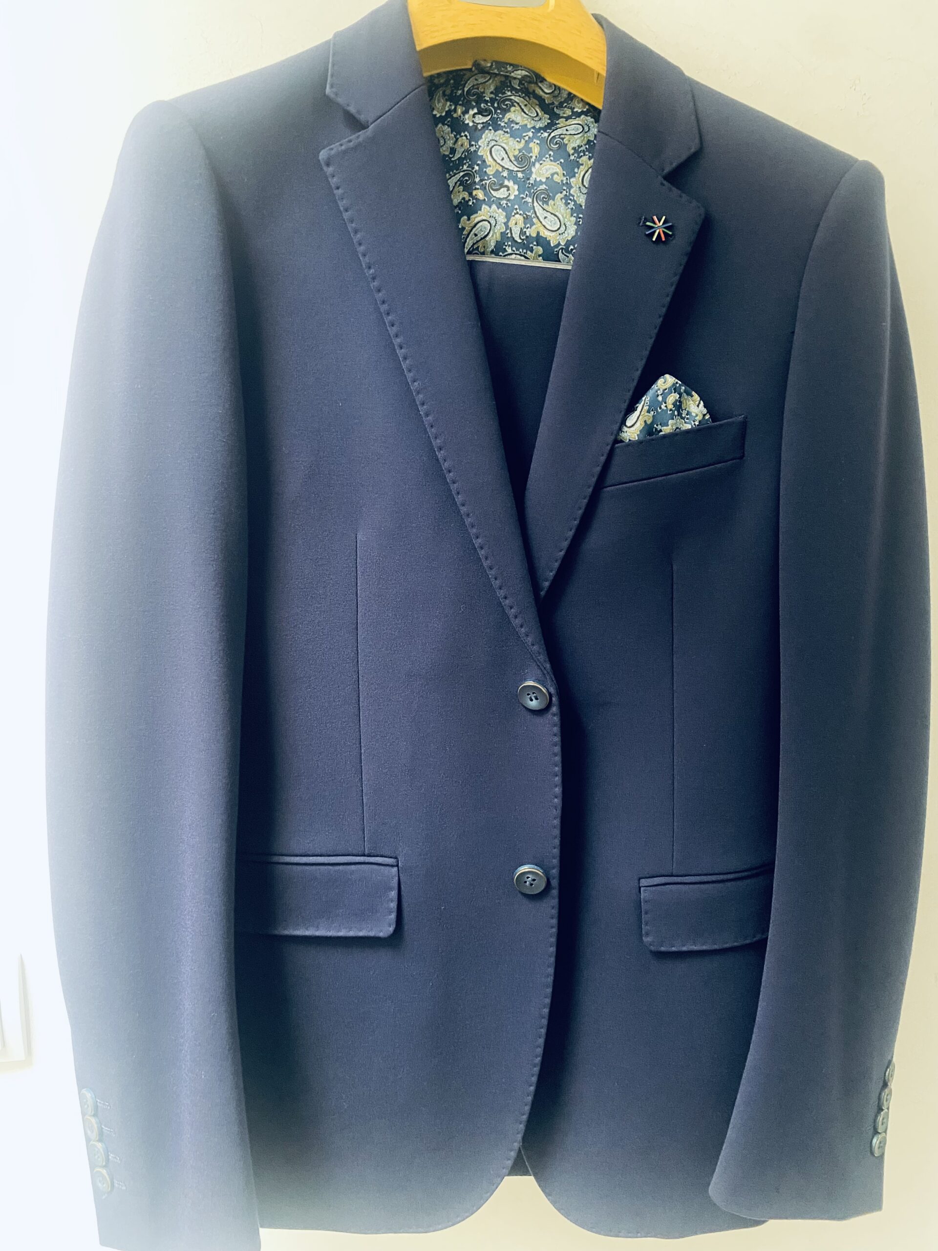 Traje de dos piezas. Americana entallada, muy cómoda, dada su elasticidad se adapta muy bien a cualquier tipo de constitución. Pantalón pitillo con cintura ajustable.