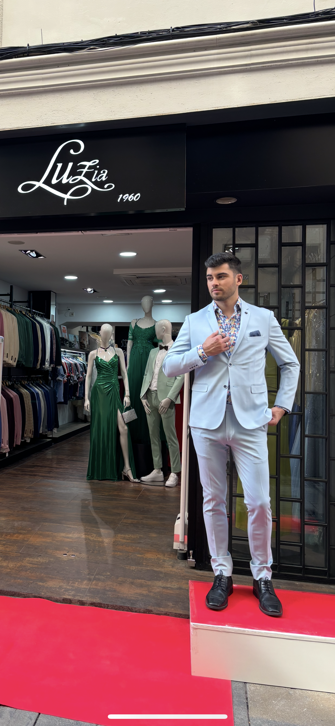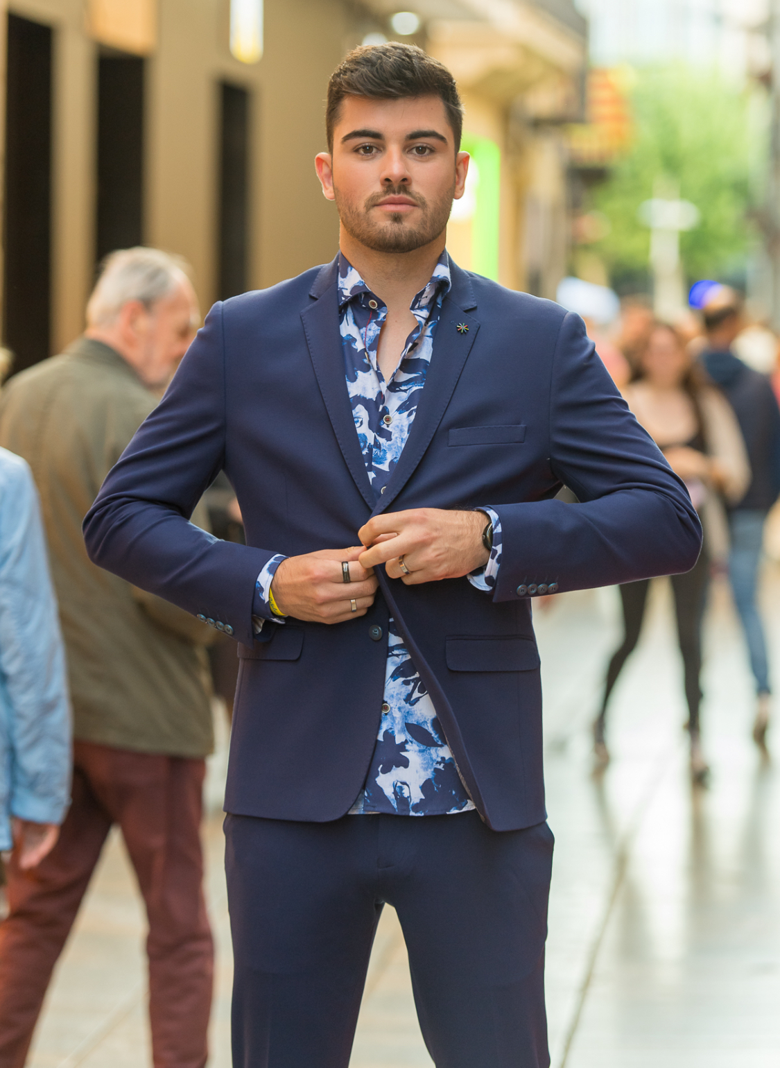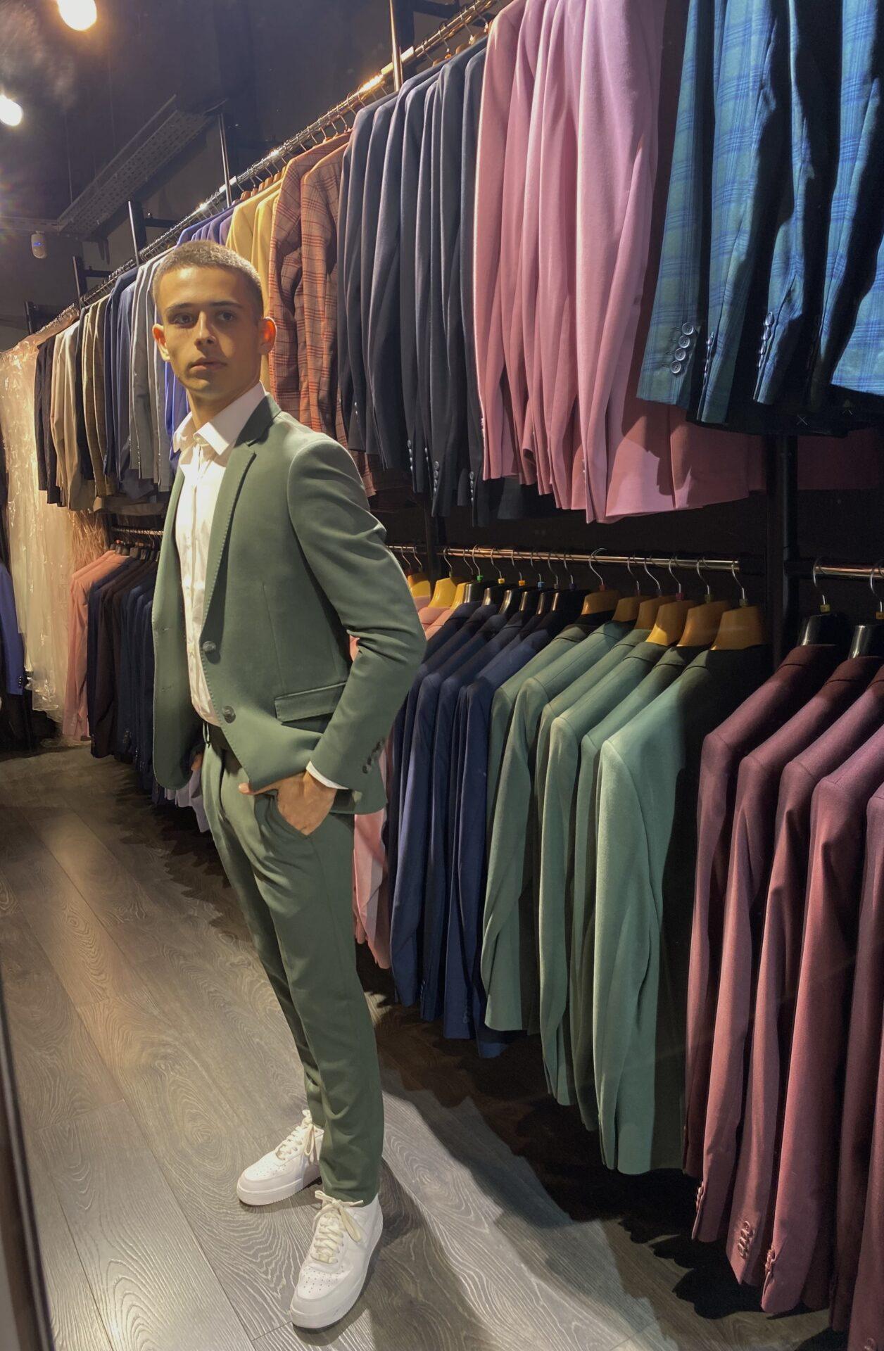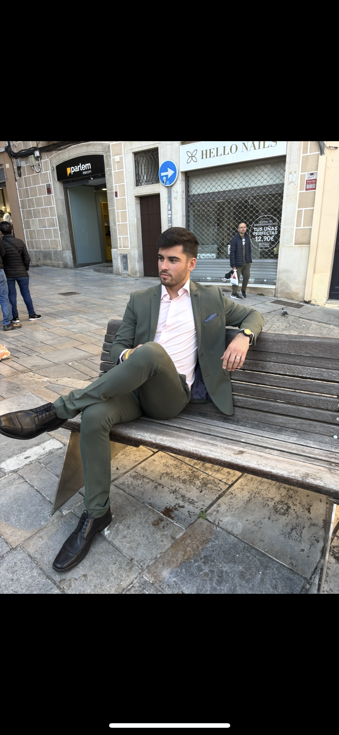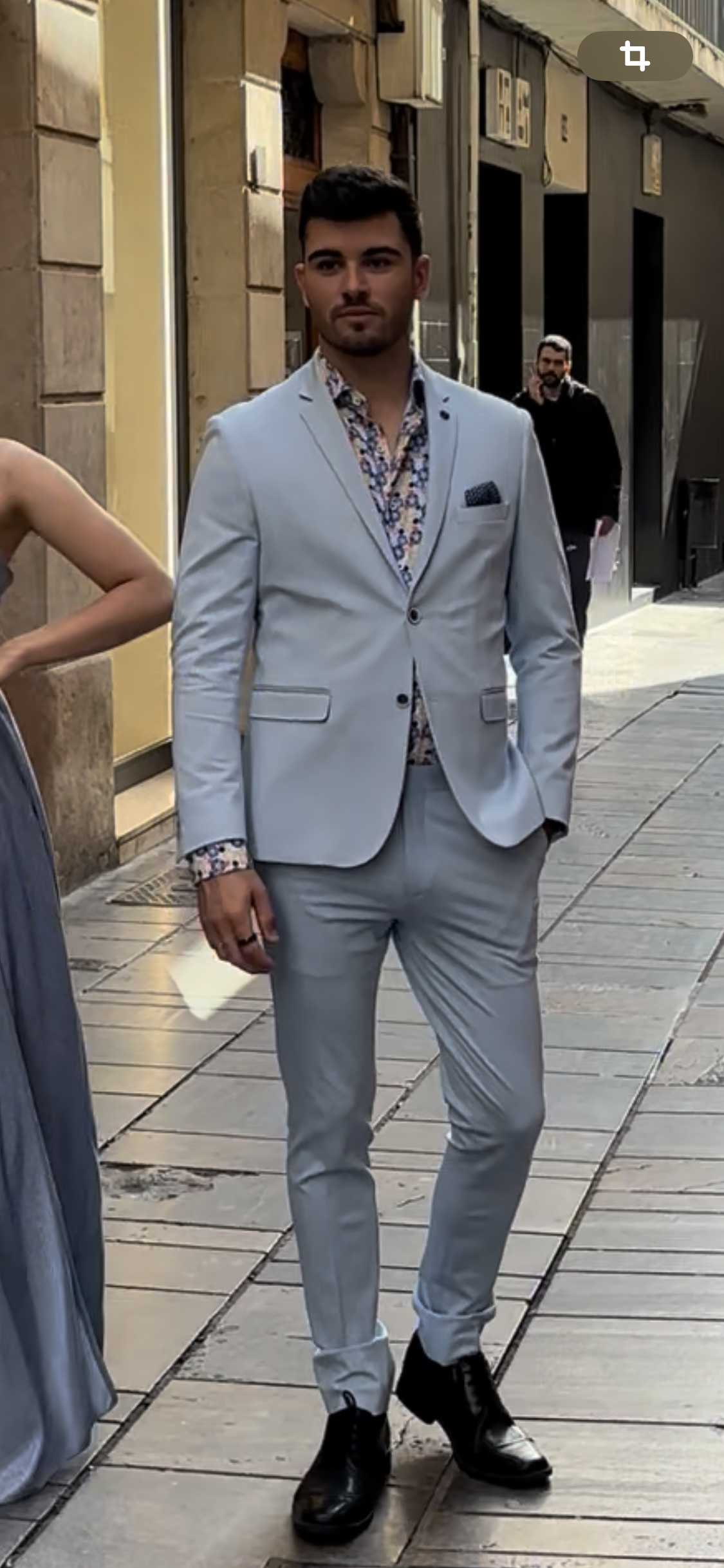 Traje de dos piezas. Americana entallada, muy cómoda, dada su elasticidad se adapta muy bien a cualquier tipo de constitución. Pantalón pitillo con cintura ajustable.