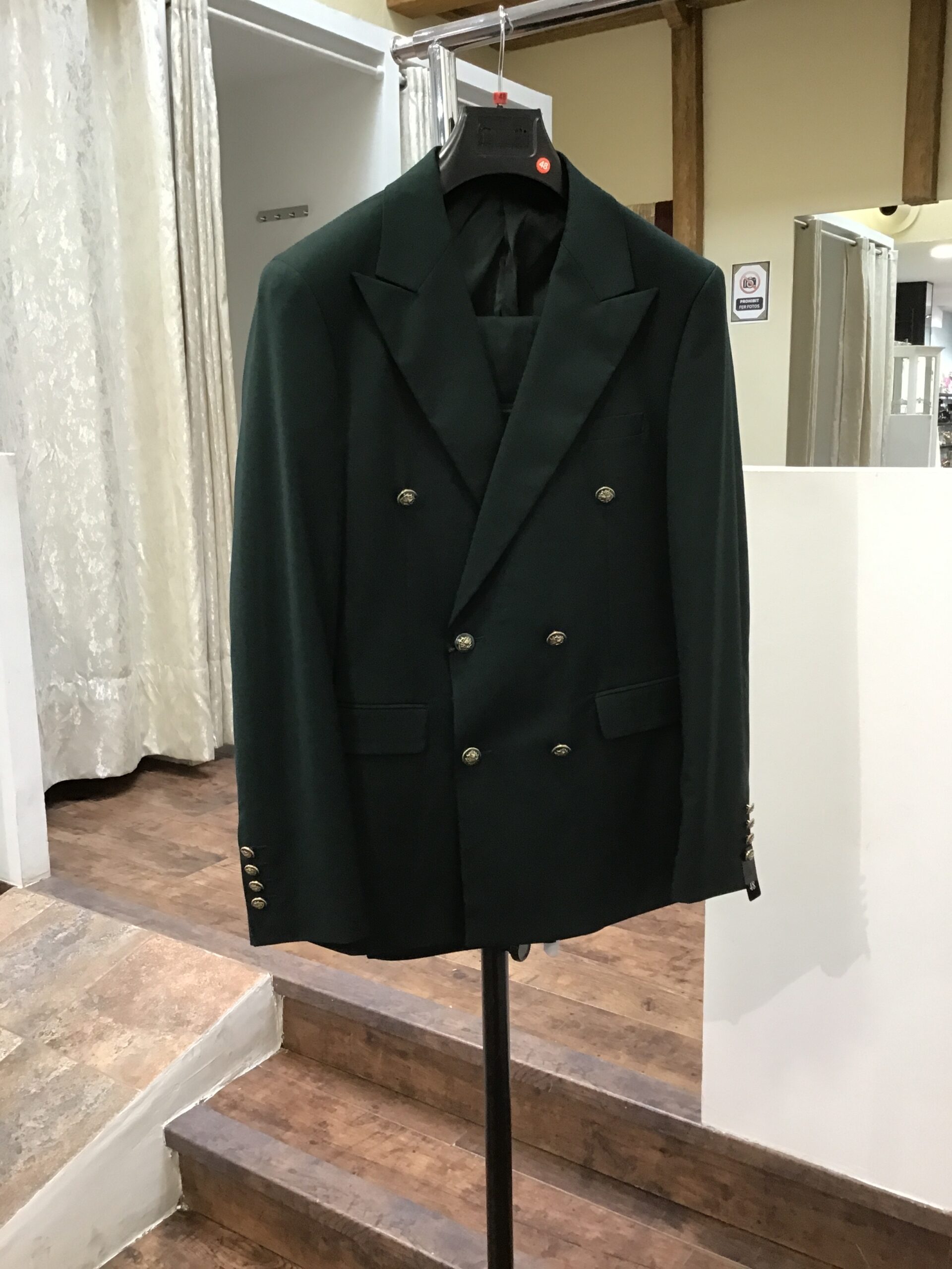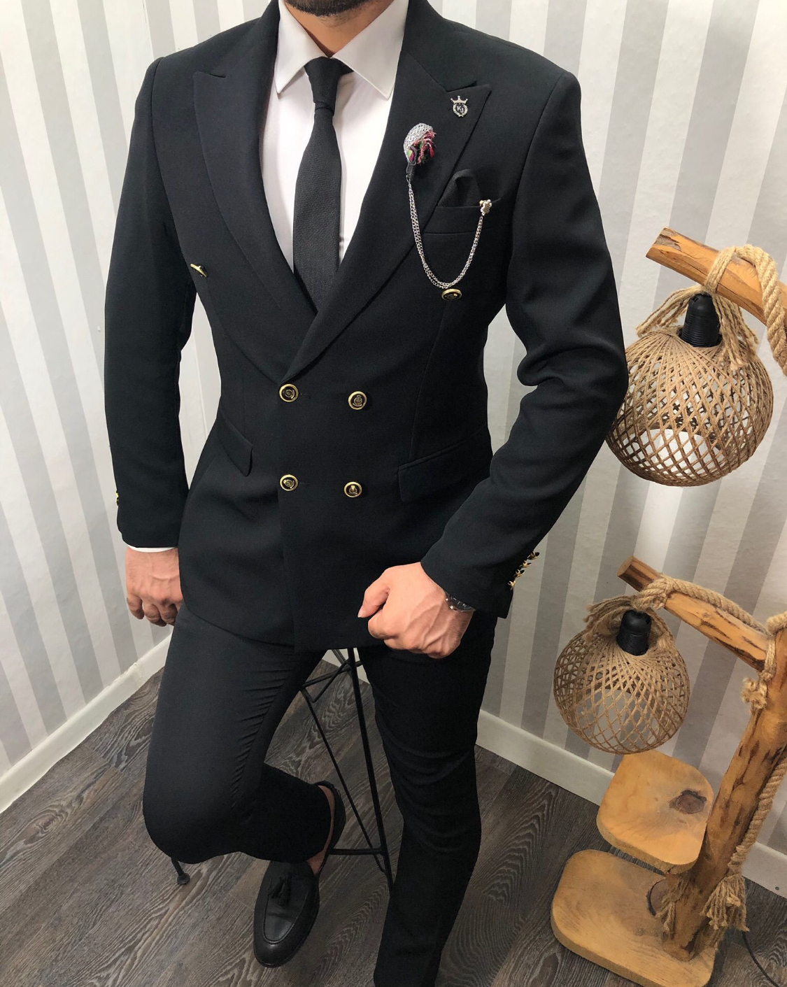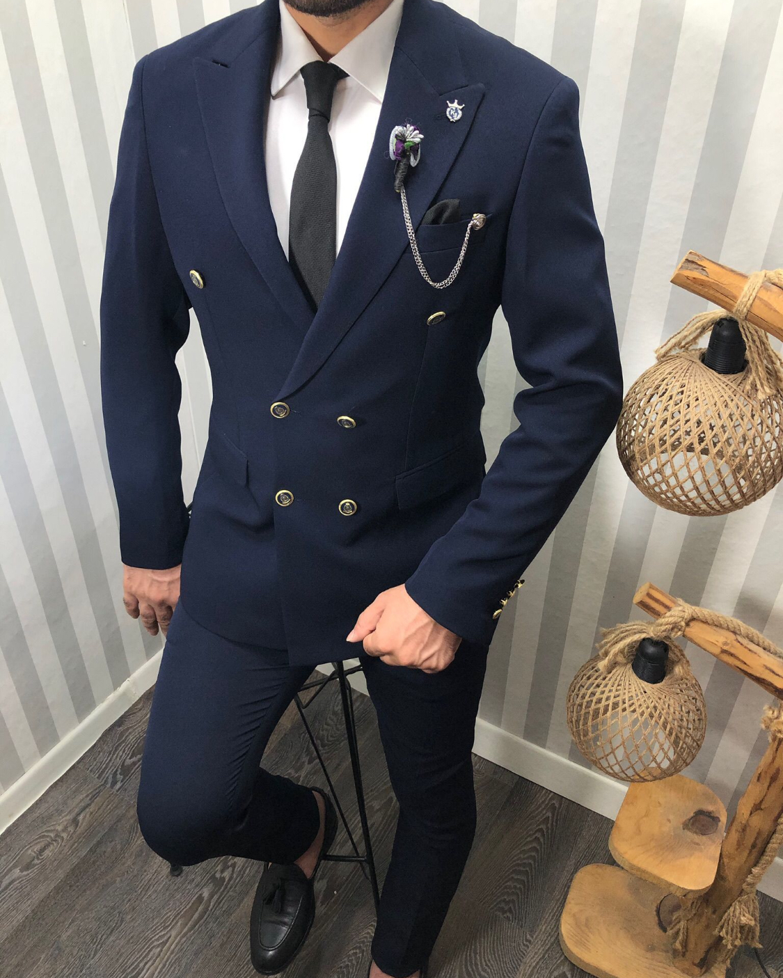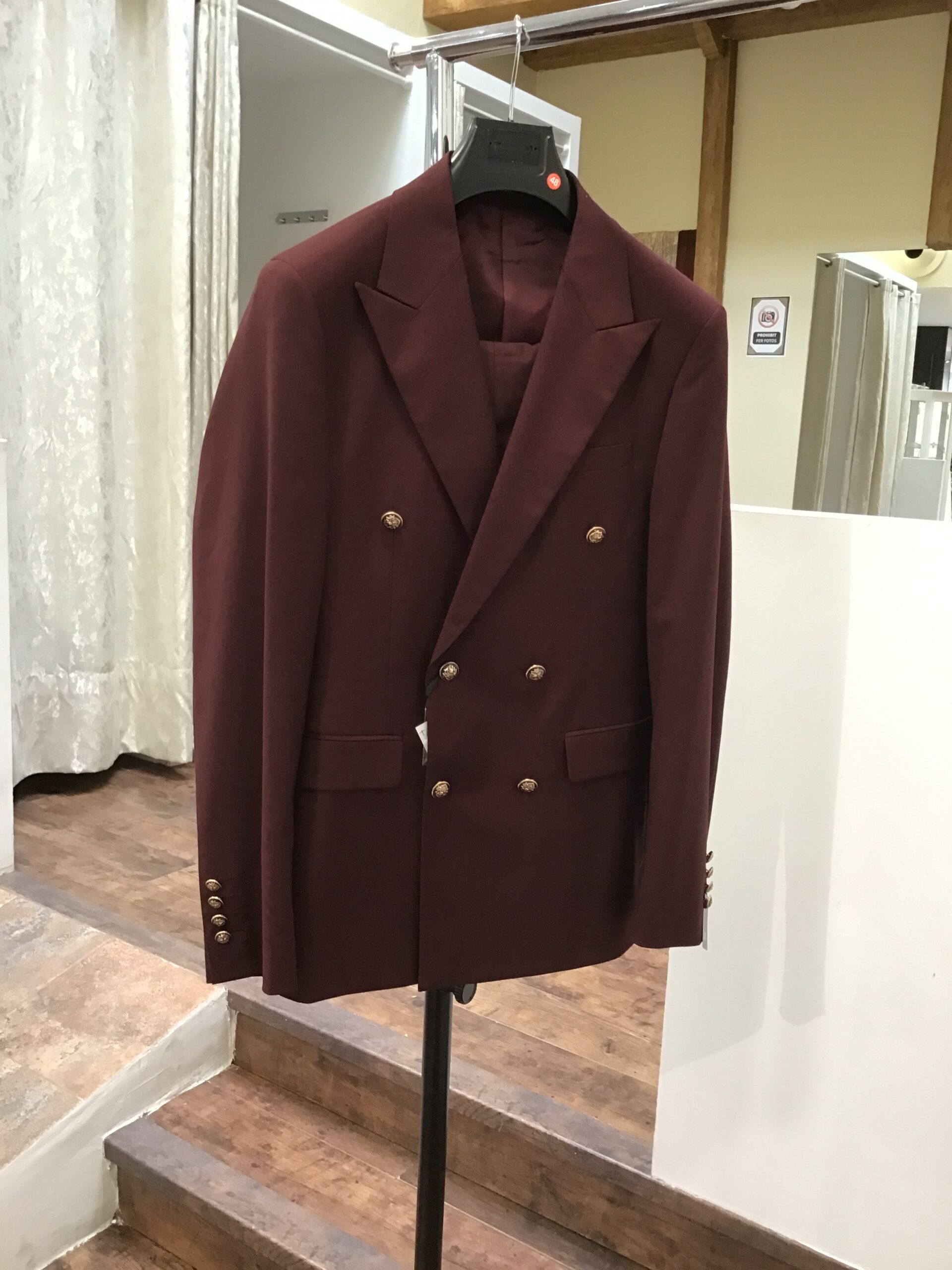 Traje de dos piezas. Americana cruzada con botones dorados a tono color. Americana entallada. Tejido en Poliéster y viscosa. Forro satinado a tono color. Pantalón pitillo.